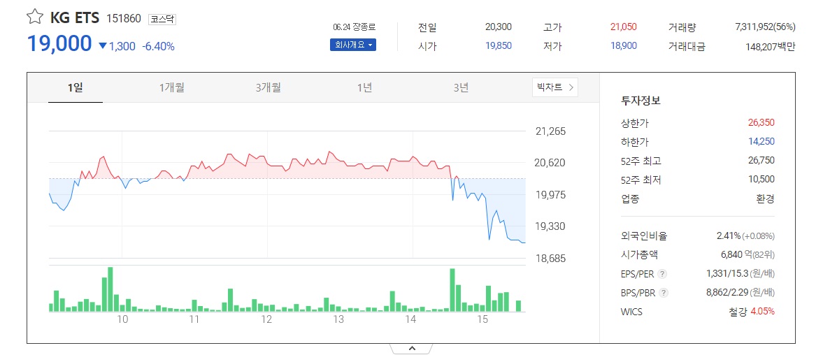 - 태풍 관련 종목 KG ETS의 기업개요.