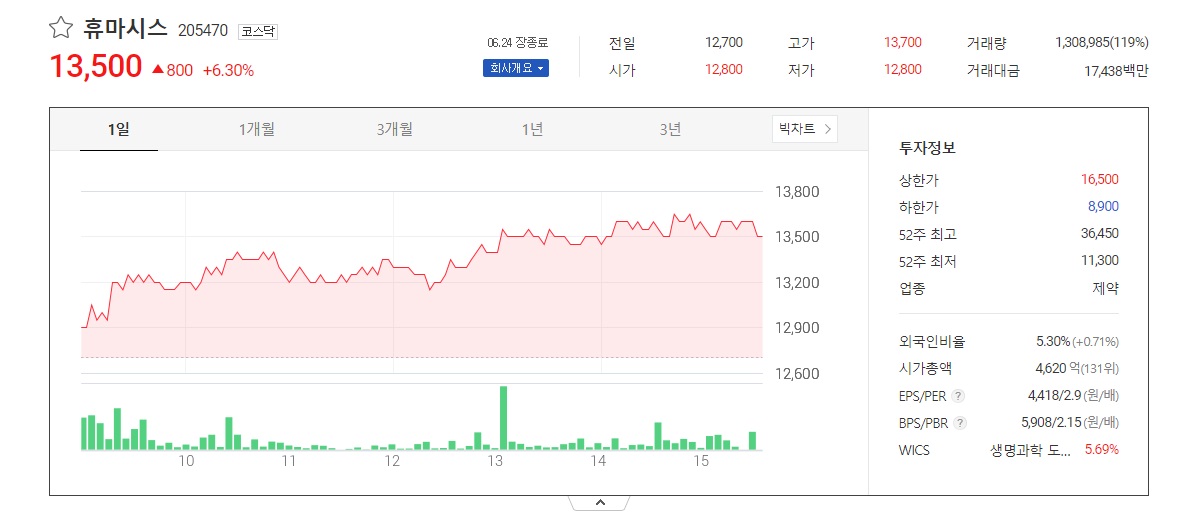 - 북한 코로나 관련 종목 휴마시스의 기업개요.