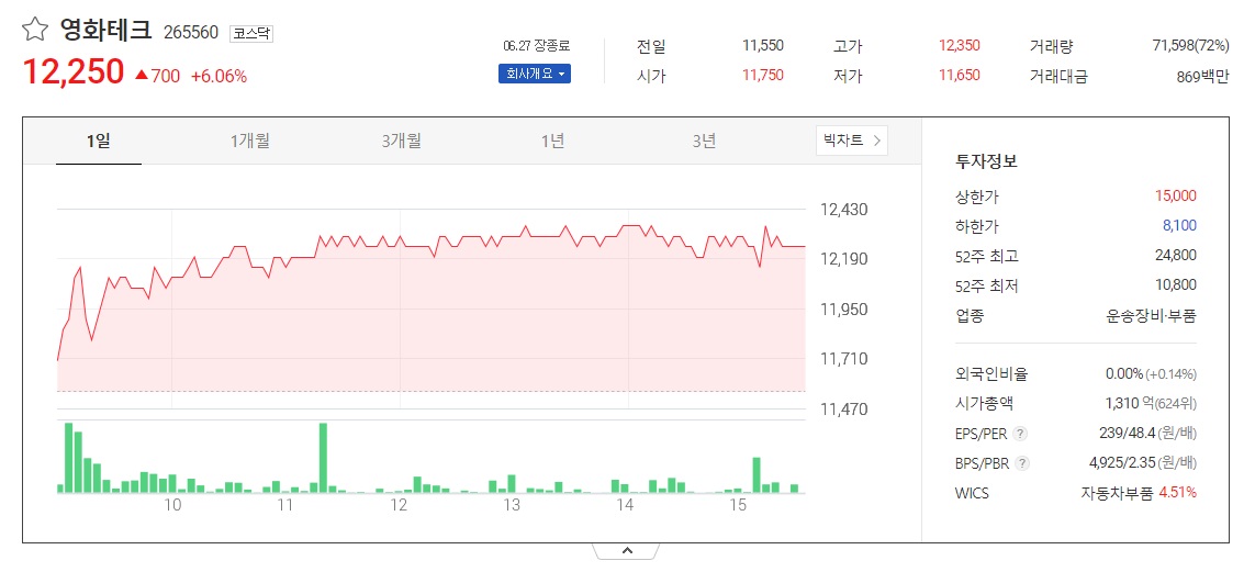 - 폐배터리 관련 종목 영화테크의 기업개요.