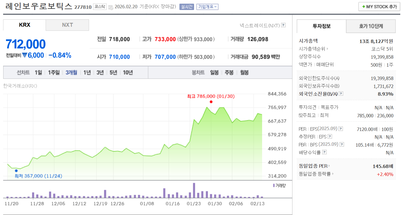 - 2026 모멘텀: LG전자의 글로벌 스마트 팩토리 구축 사업에서 수직다관절 로봇(A12 시리즈) 공급을 독점하고 있습니다. 2026년 초 주가가 9만 원대를 돌파하는 등 강력한 성장세를 보이고 있으며, 반도체 웨이퍼 이송 로봇(EFEM) 등 고부가가치 시장으로 영역을 확장했습니다.